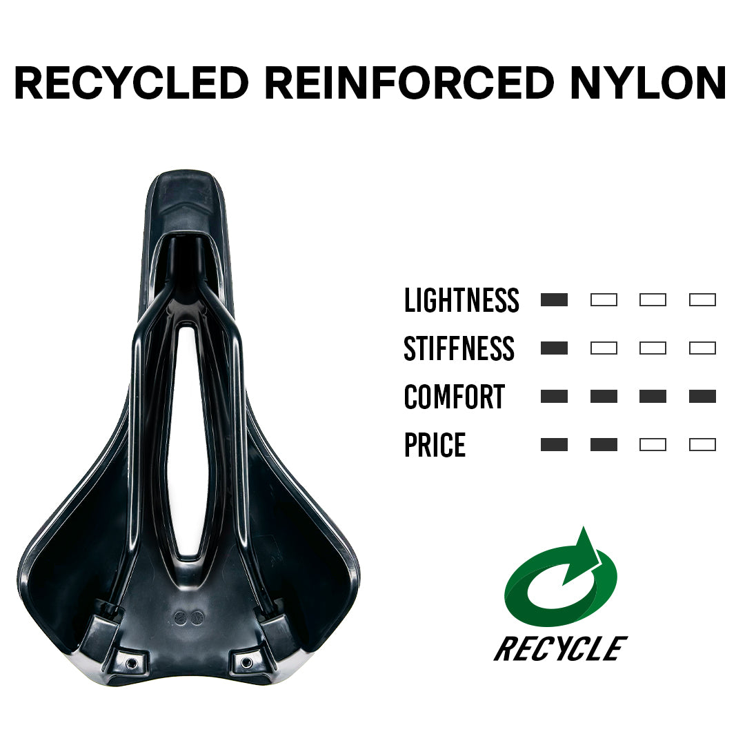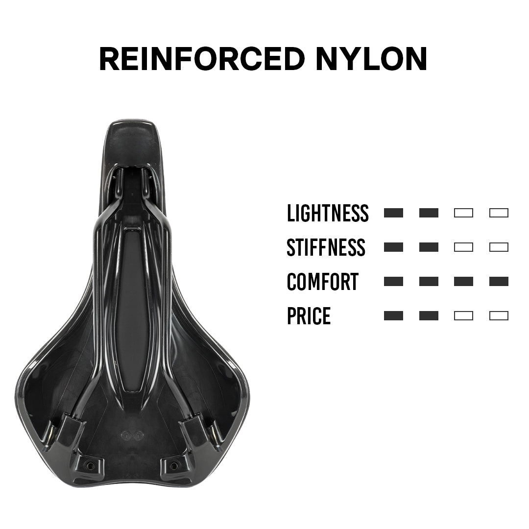 Base realizzata in nylon rinforzato, utilizzata per le selle più orientate al comfort. Estremamente flessibile ma al tempo stesso resistente e durevole.
