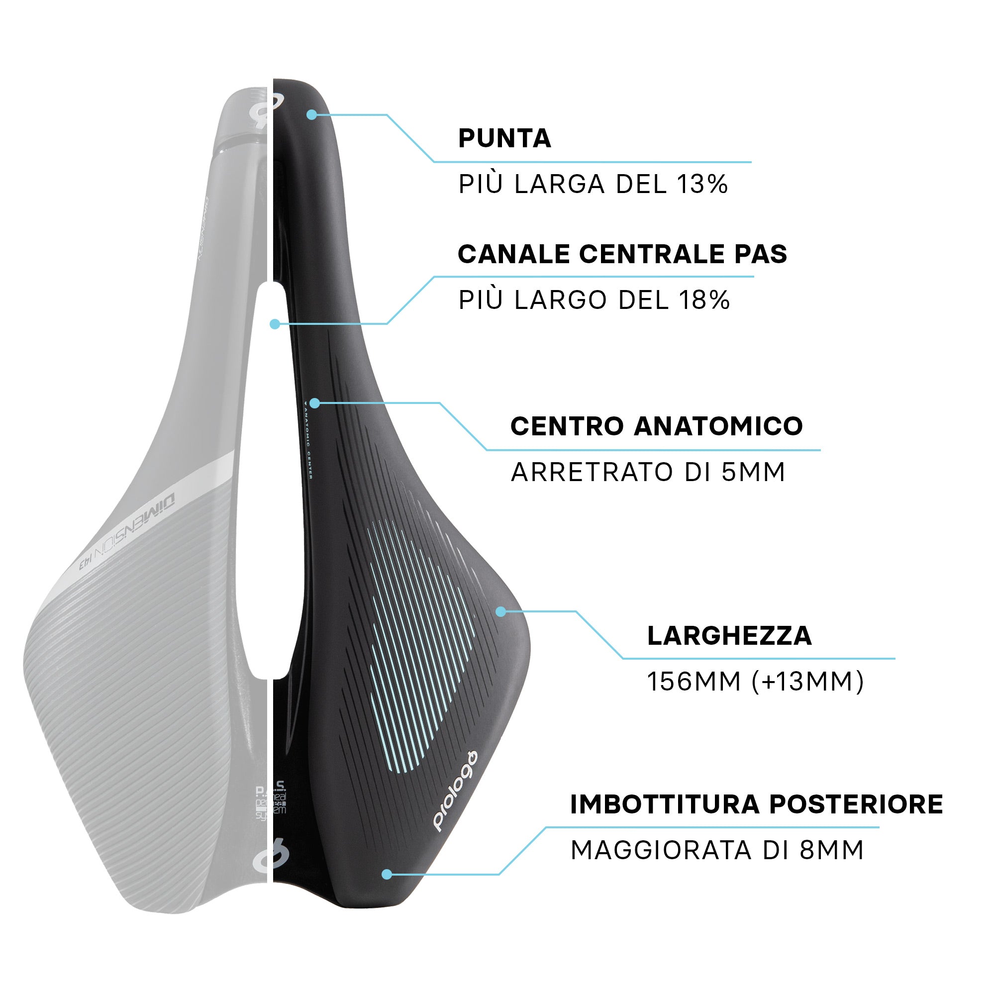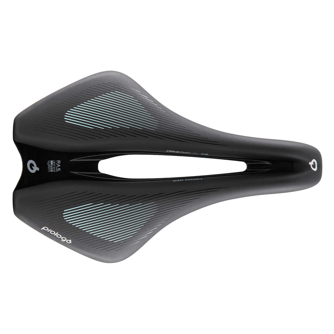 La grafica della Dimension EVA è caratterizzata da linee sottili che evidenziano la forma a V della sella, con dei dettagli azzurri che richiamano il logo EVA, donando un tocco di stile e riconoscibilità a tutta la linea femminile di Prologo.