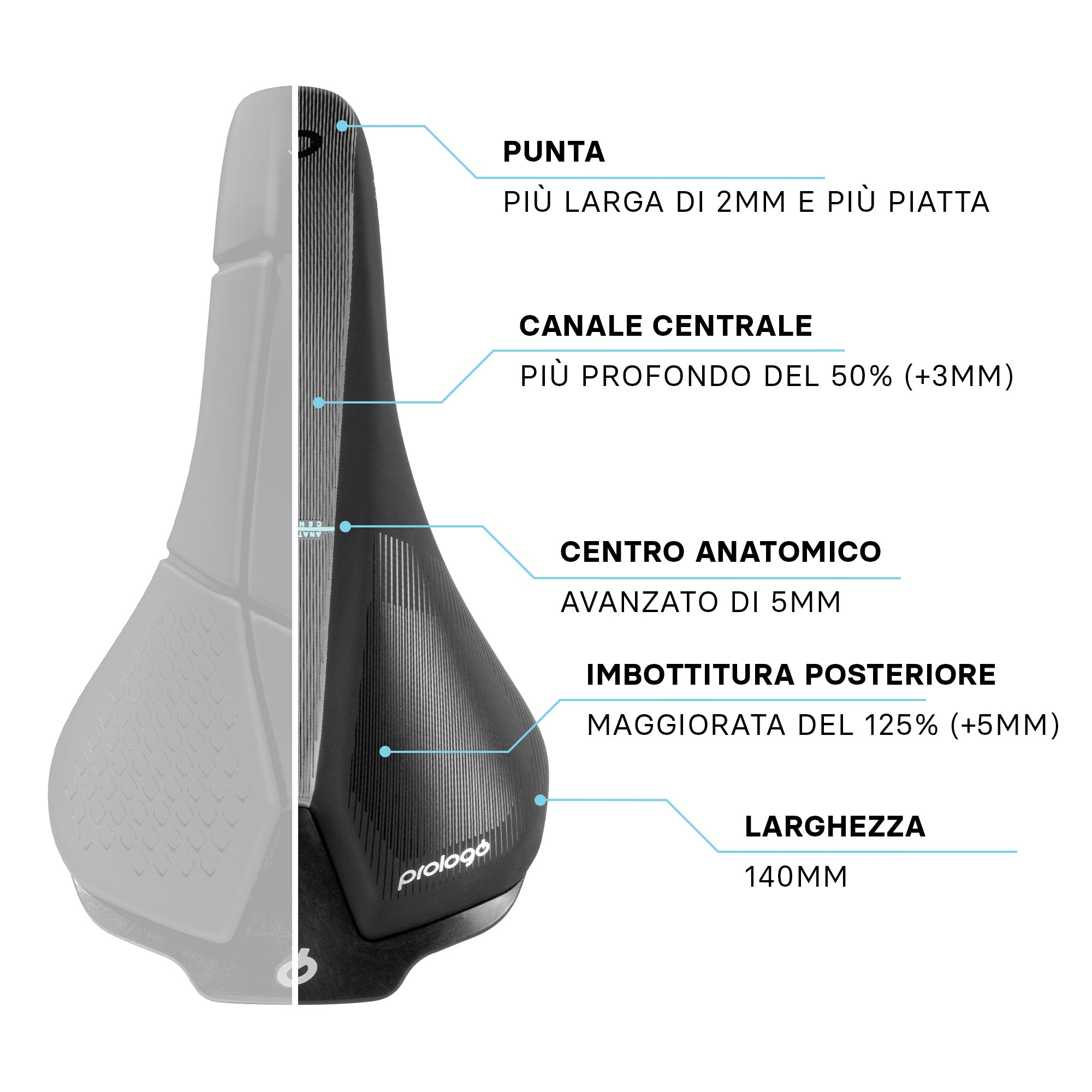 Il nuovo design dedicato alle donne presenta una larghezza di 156 mm per aumentare la superficie d’appoggio per il bacino femminile. Il centro anatomico è stato arretrato di 5 mm per agevolare il posizionamento delle ossa ischiatiche nella parte posteriore della sella dove la nuova imbottitura, con schiume a minor densità e uno spessore maggiorato di 8mm, offre il massimo supporto per incrementare comfort e stabilità.